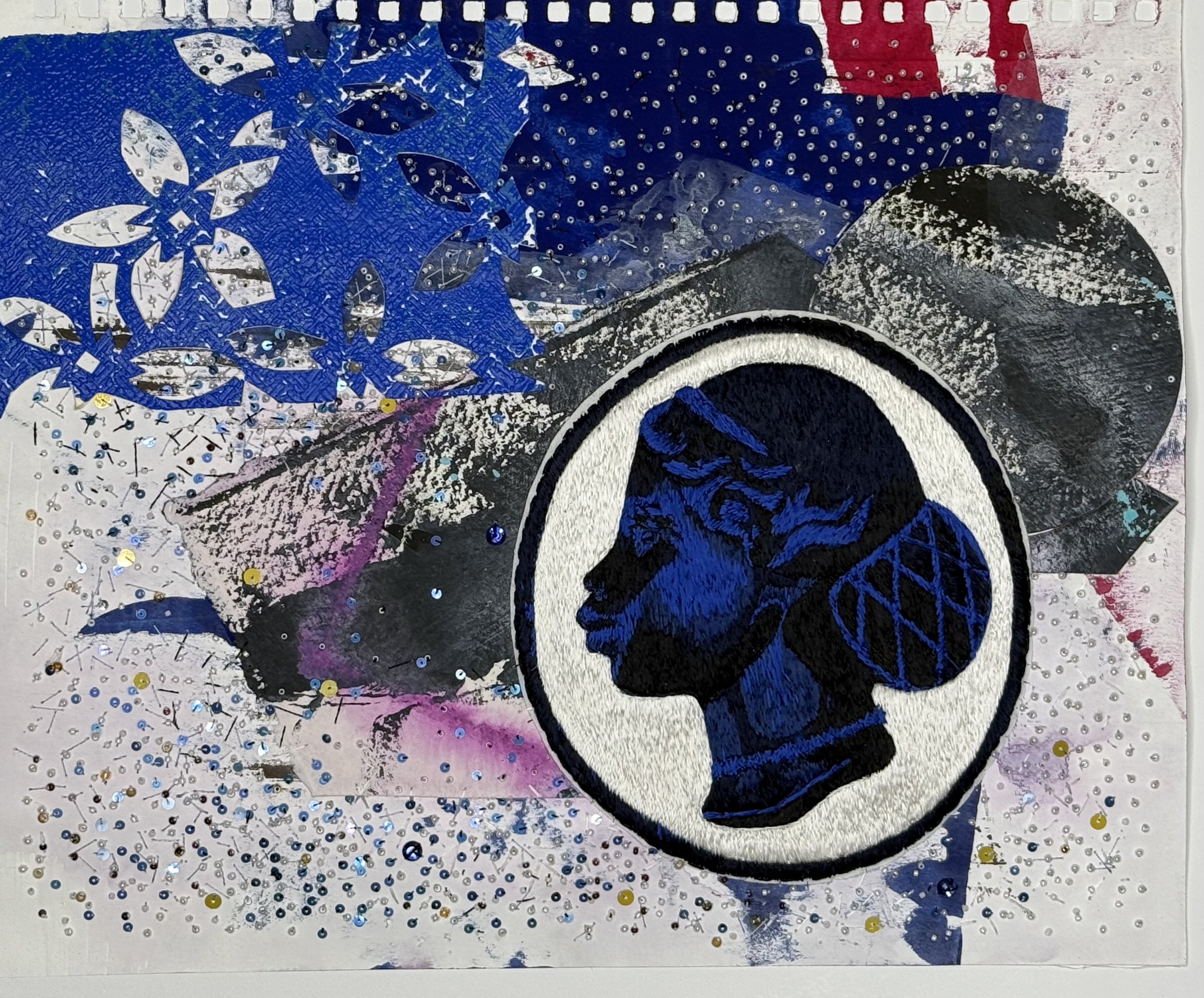 Mixed Media Collage using hand embroidery telling a visual narrative of the past, present and future, all entwined together sharing a captured moment in time. The hand embroidery is a black female artist who lived in the 1800s and was buried in an AME Mother Bethel Burying ground and forgotten by society by the 1900s when the site was turned into a kids playground. The collage nature creates an understanding of the season of spring while the painting and beadwork shares the movement of societal migration. The vintage beads were purchased at the trail of tears trading post in Oklahoma creating an environment that bridges and connects us all together.